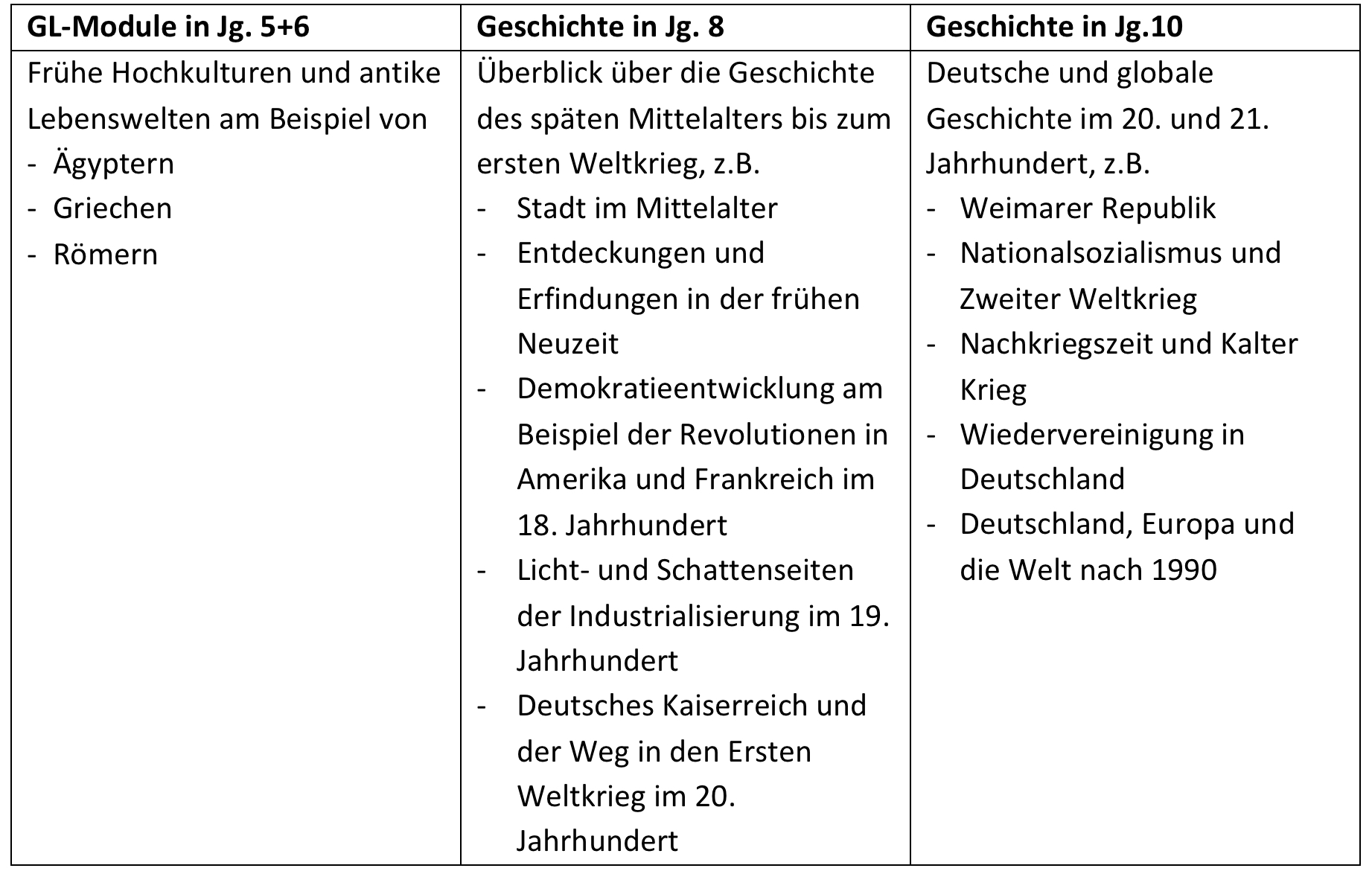 Geschichte wird an der Europaschule in den Jahrgängen 5 und 6 in Modulform im Rahmen des gesellschaftswissenschaftlichen Unterrichts (GL) unterrichtet sowie in den Jahrgängen 8 und 10 mit jeweils 2 Wochenstunden (immer 65-Minuten-Stunden).